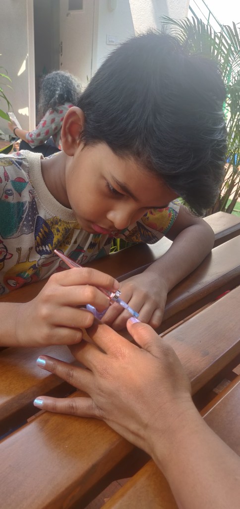 He asked to paint my nails. I agreed. He brought out a fancy, iridescent paint bottle. Big sister watched with amusement. I haven’t ever agreed to let her paint my nails. I’ve always been too busy to wait for the polish to dry. But this was a quarantine day, everything was different. He whipped out the brush and swiped the polish right up, from the edge of the nail towards my nail bed. The opposite of how you’d normally do it. Big sister cackled and rushed to help . “Seeeee, this is how you should do it…” she started. I stopped her and said – “Let him!”