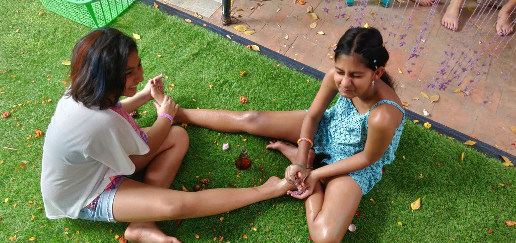 Immediately, many lent a hand, foaming up toes, spraying glitter onto each other’s hair, buffing fingernails and braiding flowers. It was a fab, relaxing time for them (and us, parents!). But there were a few who just couldn’t get (their hands) into it; painted their own nails, did their own hair, and left their junk strewn around. I asked for help, but they walked away as someone else cleared up after them. It reminded me of my earlier self, honestly – self-absorbed and clueless about picking up after yourself.